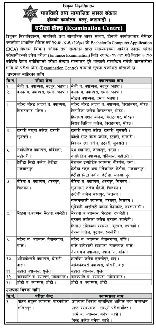 Tribhuvan University, Faculty of Humanities and Social Science Office of Dean published examination centers for BCA entrance examination with a list for all Colleges. Exam is scheduled for 28 Bhadra 2076 B.S. at 11 A.M. sharp at respective exam centers by Tribhuvan University in 2019.