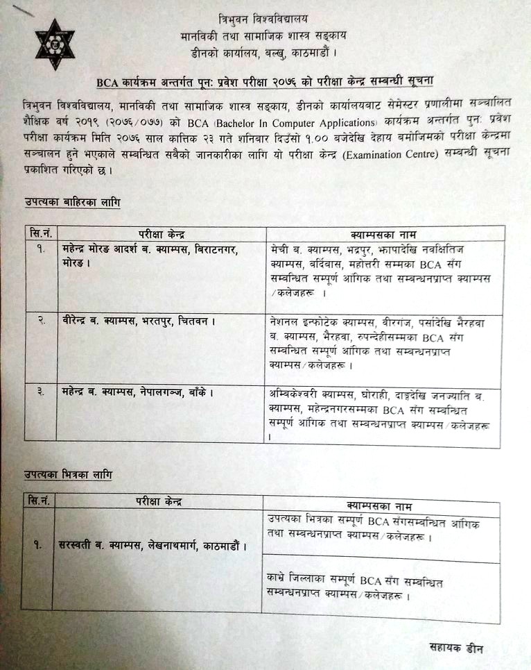 Tribhuvan University Faculty of Humanities and Social Science Department will be conducting the re-entrance examination for BCA program on 23rd Kartik 2076 B.S. from 1 P.M. onward. The list of BCA re-entrance exam Centers has been recently published for all Colleges of T.U. inside and outside Kathmandu Valley. The official notice has been posted here.
