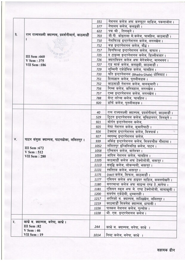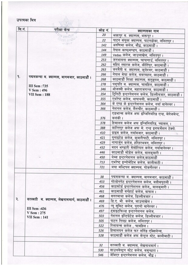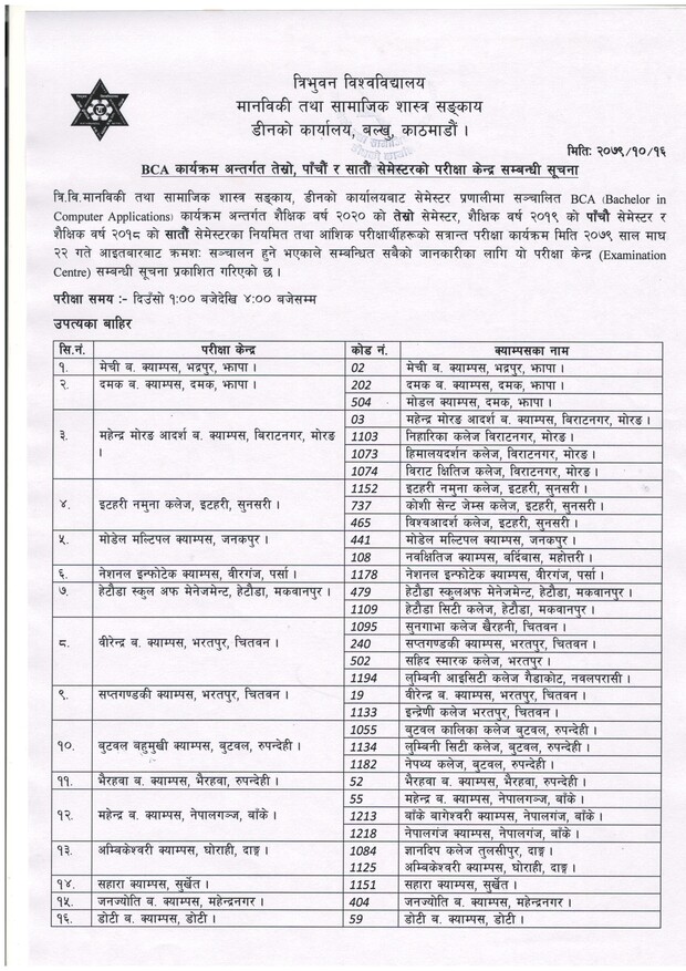 As per the notice published on 16 Magh 2079, FOHSS division of Tribhuvan University has released the examination centers for the third semester of the BCA 2020 batch, fifth semester of the BCA 2019 batch, and seventh semester of the 2018 batch. These exams are scheduled to take place from 22 Magh 2079 B.S. The examination centers have been designated for colleges offering the BCA program both within and outside the valleys. The exams will be conducted between 1 P.M. to 4 P.M.